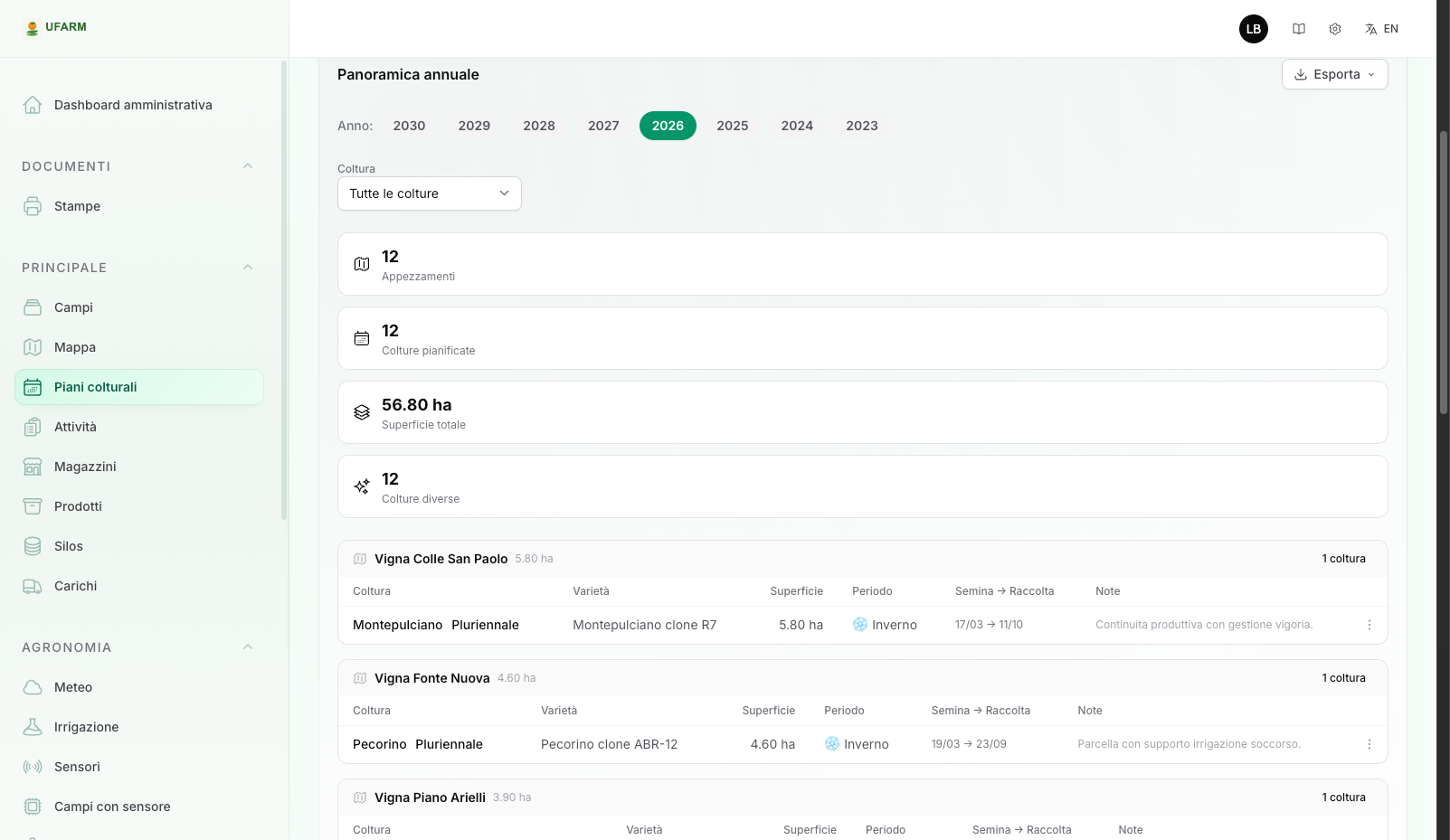 Organizza le rotazioni, assegna le colture agli appezzamenti e pianifica ogni intervento stagionale da un unica schermata.